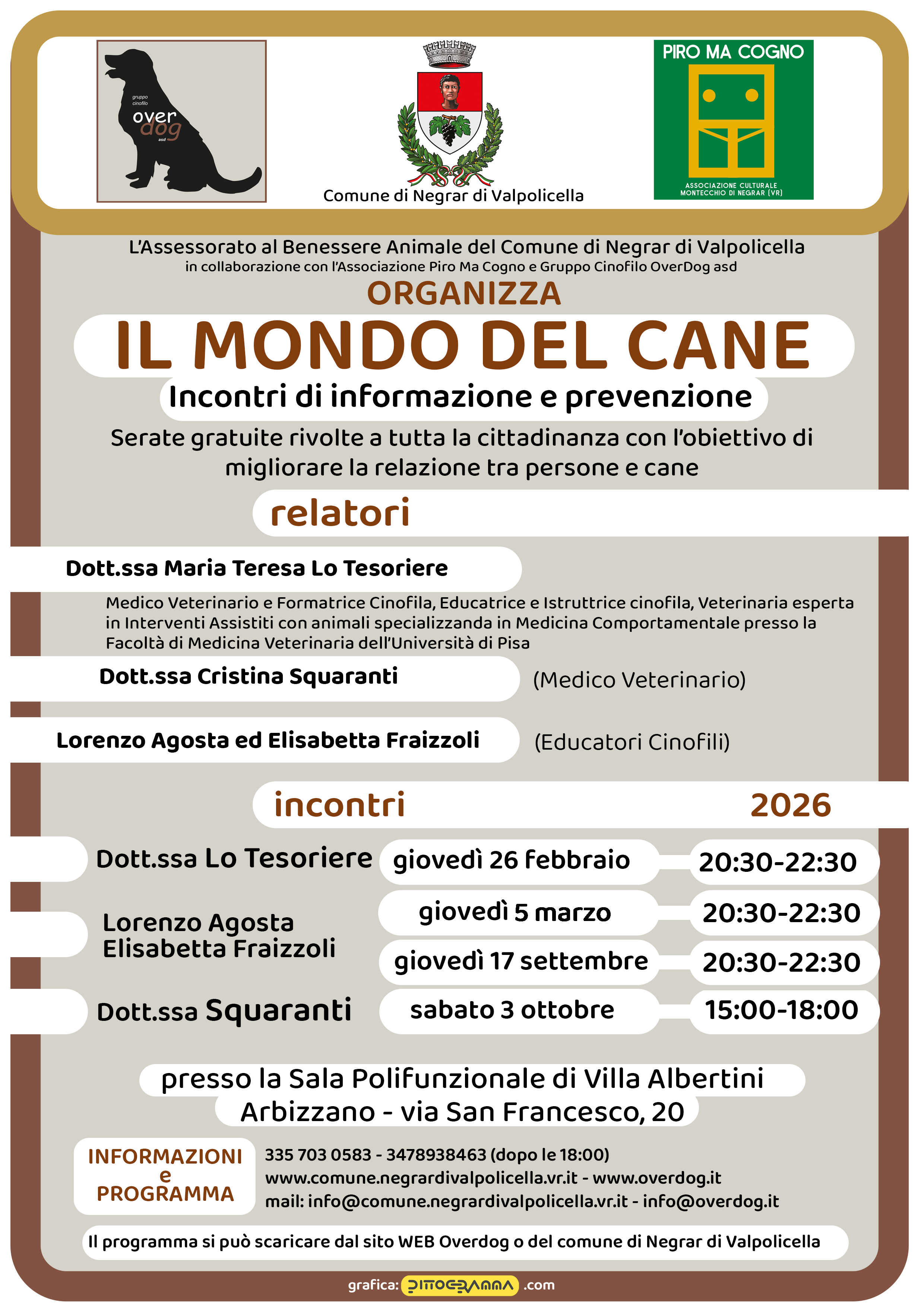 Incontri informativi e preventivi per migliorare la relazione tra persone e cani Organizzati dal Comune di Negrar di Valpolicella – Assessorato al Benessere Animale In collaborazione con Associazione Piro Ma Cogno e Gruppo Cinofilo OverDog asd